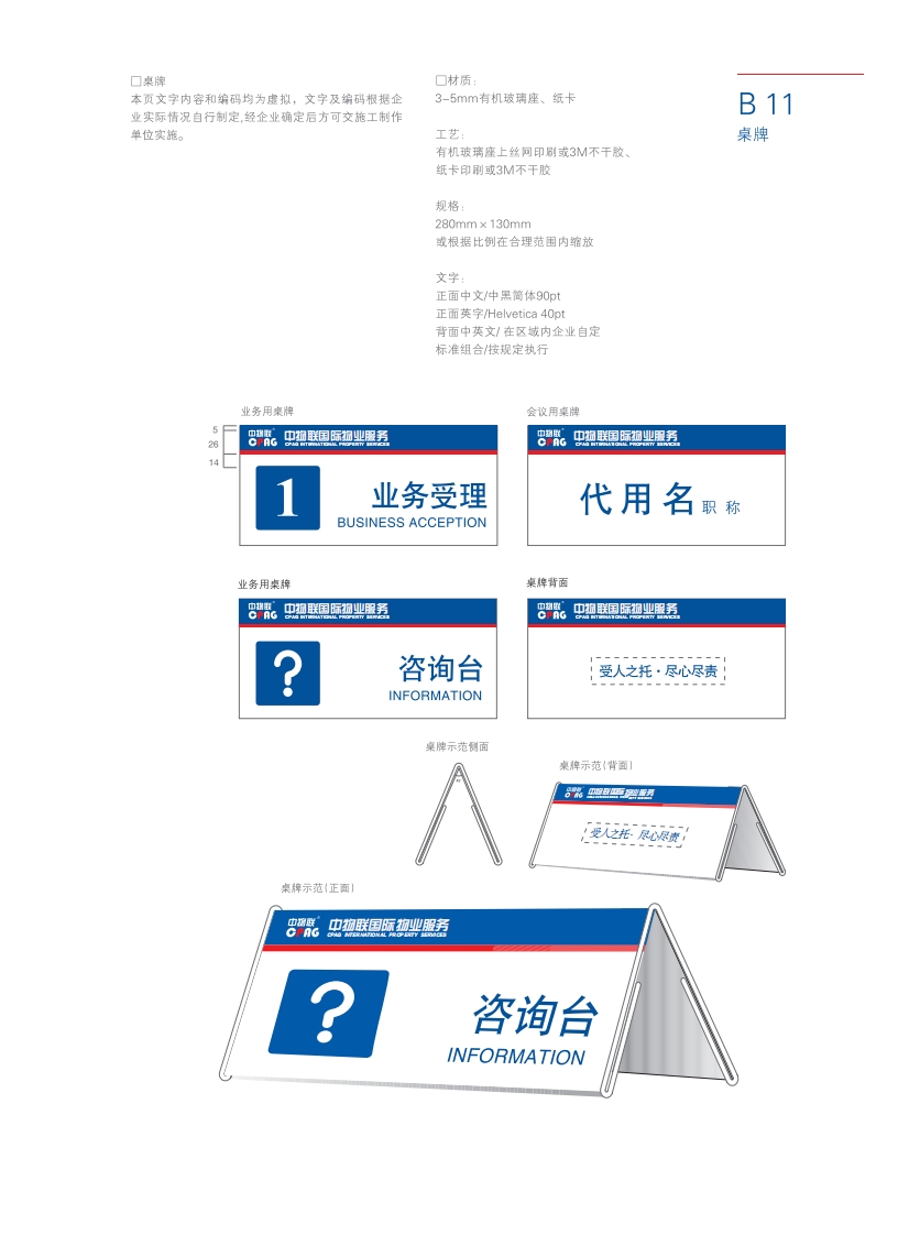 口桌牌本页文字内容和编码均为虚拟,文字及编码根据企3-5mm有机玻璃座、纸卡B11业实际情况自行制定,经企业确定后方可交施工制作单位实施。工艺桌牌有机玻璃座上丝阿印刷或3M不干胶纸卡印刷或3M不干胶规格280mm×130mm或根据比例在合理范围内缩放文字:正面中文/中黑简体90pt正面英字/Helvetica40pt背面中英文/在区域内企业自定标准组合/按规定执行业务用桌牌会议用桌牌141业务受理代用职称BUSINESS ACCEPTION业务用桌牌咨询台:受人之托·尽心尽责INFORMATION桌牌示范侧面咨询台INFORMATIONB12意见箱220mm100mm意见箱280mm联,中物联国际物业服务中物联B21钥匙扣、水杯烟灰缸CPAG中物联°CPAGCPAG