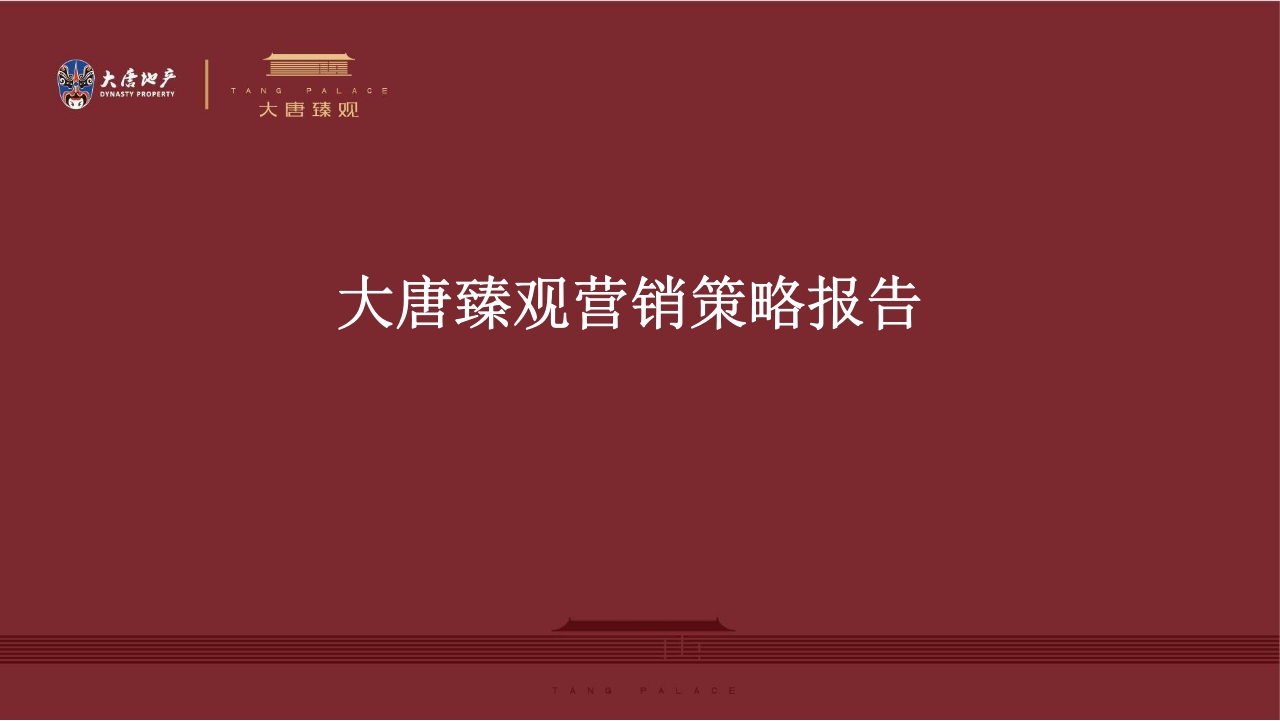 T A N G P A L A大唐臻观大唐臻观营销策略报告P A L A C E明确年度目标DYNASTY PROPERTYT A N G P A L A C E大唐臻观更高目标提高大唐口碑及影响力进阶目标收获利润,开拓大唐产业市场基本目标达到销量任务2018年重要节点DYNASTY PROPERTYT A N G P A L A C E大唐臻观内部加推售楼处/示范区开放加推加推3月10日首期开盘9月中旬12月上旬6月30日4月6月7月明11月12月样板房开放内购首开二次加推加推3月10日11月中旬