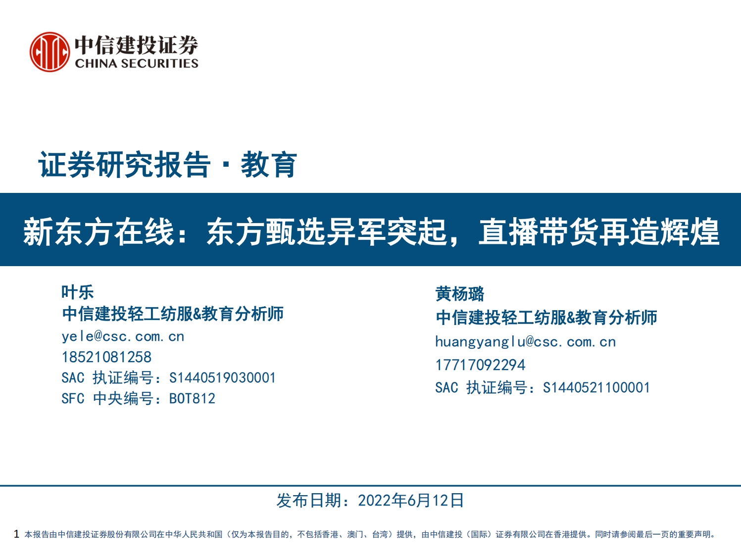 中信建投证券CHINA SECURITIES证券研究报告·教育新东方在线:东方甄选异军突起,直播带货再造辉煌叶乐黄杨璐中信建投轻工纺服&教育分析师中信建投轻工纺服&教育分析师yele@csc.com.cnhuangyangl u@csc.com.cn1852108125817717092294SAC执证编号:S1440519030001SAC执证编号:S1440521100001SFC中央编号:B0T812发布日期:2022年6月12日1本报告由中信建投证券股份有限公司在中华人民共和国(仅为本报告目的,不包括香港、澳门、台湾)提供,由中信建投(国际)证券有限公司在香港提供。同时请参阅最后一页的重要声明。核心观点>凭借双语直播带货,“东方甄选”异军突起,新东方在线浴火重生。21年中教育行业“双减”政策发布后,新东方在线全面停止K12业务,21年底俞敏洪老师在抖音平台推出助农业务“东方甄选”品牌进入直播带货领域,运营主体由新东方在线全资持股。东方甄选主打售卖农产品,主播为新东方名师转型而来,采用中英双语+穿插历史文化等知识讲解直播带货,构建东方甄选差异化直播间,自6月10日爆火已来,抖音账号粉丝从100万-快速增长至290万+(截至6/12晚上7点),GMⅣ从百万级别爆发增长至接近2000万(6月11日)、直播带货进入抖音前十名。>对比头部抖音直播间,东方甄选做的怎么样了?横向对比抖音平台头部主播,前十名多粉丝数量在1000万+,日均GMW在1000万+、日均观看数量达到5w+。相比而言,东方甄选近两日GN、观看数量已跻身头部直播间,后续仍需加大粉丝数量留存,仍有较大提升空间。对比交个朋友(原罗永浩)抖音直播间,其粉丝数已达量1700w、场均GMV500万+,日均GMV1000万级别;东方甄选主打农产品,食品百货商品占比达80%+,客单值是交个朋友的近一半(73元),化妆品、图书文具等品类逐渐开拓中,后续客单值有望逐步提升。>如何看待东方甄选未来发展空间及新东方在线估值?假设按照目前粉丝增长速度(日增70-80万人),若衰减速率不高,则在未来2周东方甄选粉丝数量有望达到千万人。假设按照日均GN千万元进行估算,东方甄选年GMⅣ将达到37亿元,在此参考交个朋友直播间,净利润/GMW可达3%,伴随自营产品比例加大和客单价提升,利润率有望提升至5%,在此给予20倍PE,给予37亿市值。另外,公司大学业务收入5亿元,按照10%净利率,20倍PE计算,对应10亿市值。考虑公司在手净现金及等价物16亿元,合并计算市值63亿元,目前公司市值53亿人民币,市值仍有近20%涨幅空间。考虑到公司旗下其他直播间的陆续发力,新东方在线后续仍有提升潜力。>风险提示:双语直播潜在政策风险、产品质量风险、用户增长不及预期风中信建投证券2数据来源:wind,中信建投预测CHINA SECURITIES目录·第一章东方甄选于21年底上线,近期凭借双语直播异军突起·第二章对比头部抖音直播间,东方甄选做的怎么样了?·第三章附:新东方在线基本财务数据中信建投证券3CHINA SECURITIES
