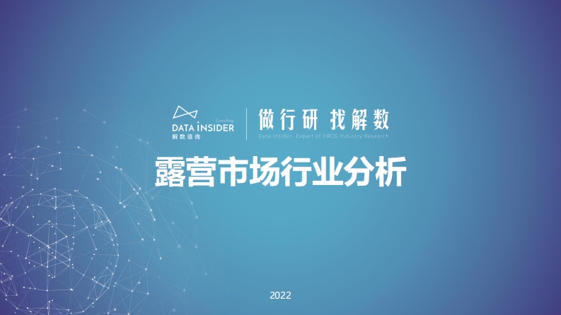 DATA INSIDER做行研找解数露营市场行业分析2022张杨老师带你看品牌解数咨询第144期报告露营市场行业分析做行研找解数DATA INSIDER行业综述-露营/旅游/登山帐篷从2019年5月起,市场访问人数逐年增长,销售额也随若访客人数逐年增加,从2020年全年2589.08万访客数到2021年全年3407.81万访客人数,一年增长近30%,且销售额从2020全年5.31亿元到2021年全年7.70亿元增长近44%,可以看出访客价值在该类目的明显增长,是一个高速成长型的赛道。同比2020年-2021年月度数据来看,季节对产品的影响远大于大促,618、双十一这种优惠力度高的大促销售额没有明显拉升,反而基本无大促的4月成为行业的核心成交月份。从近8个月的卖家数情况来看,部分卖家逐渐退出这个市场,减量非常明显,整体卖家数缩减,有交易卖家数上升,越来越多的卖家获得交易。TOP11-20商家市场占有率上明显,从8%上张到23%+。TOP10商家的市场占有率则出现了下滑的趋势,整体来看,露营/旅游登山怅篷T0P11-20商家的张势明显,值得关注·从品牌数据可以看出,分销盛行,部分品牌纯靠分销,消费者在行业热销的4月加大对头部品牌官旗的购买。从TOP10T商品来看,市面上的热门商品主打自动、速开,以懒人式、低操作难度为核心卖点。·产品搜索词主要以品类词为主,在搜索词上品牌效应并不明显。女性仍然是该赛道的主力军,主要集中在25-34岁的女性,但男性购买者的客单价更高。做行研找解数DATA INSIDER