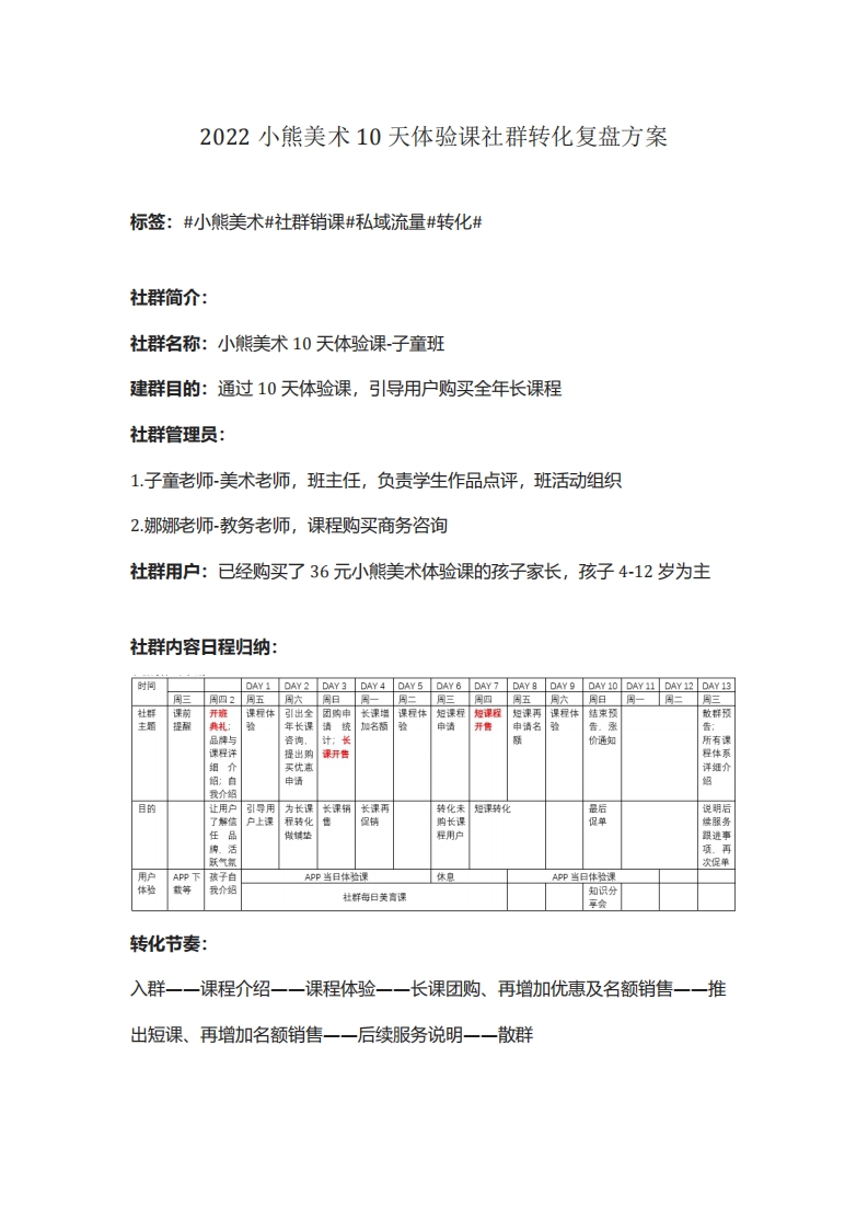 2022小熊美术10天体验课社群转化复盘方案标签:#小熊美术#社群销课#私域流量#转化#社群简介:社群名称:小熊美术10天体验课子童班建群目的:通过10天体验课,引导用户购买全年长课程社群管理员:1.子童老师-美术老师,班主任,负责学生作品点评,班活动组织2娜娜老师-教务老师,课程购买商务咨询社群用户:已经购买了36元小熊美术体验课的孩子家长,孩子4-12岁为主社群内容日程归纳:DAY 1 DAY 2 DAY3 DAY 4 DAY5DAY 6 DAY 7 DAY 8 DAY 9 DAY 10 DAY 11 DAY 12 DAY 13周三三课前开班课程体引出全团购申长课增课程体短误程短课程短课再课程体结束预提请统申清开售申清名验品牌与价通如所有课课程详程体系买优惠详细介申清目的让用户引导用为长课长课销长课再最后说明后了解信户上课程转化购长课续服务任品程用户项.再次促单用户APP下玻子自APP当日体课知识分转化节奏:入群一一课程介绍一一课程体验一一长课团购、再增加优惠及名额销售一一推出短课、再增加名额销售一一后续服务说明一一散群(在课程体验及销售过程中,陆续插入课程特色及优势介绍、老客好评、购课顾虑回复等内容)部分截图:入群公告开班典礼预告开班典礼物流通知等【定级名体验课手机号】,下提醒上课引出团购长课这种没有地城制在都能学后价格是2800统计人数申请优惠催促成交解公告四:25人以上0团活动38元亮点&复用策略:1.重点环节的内容规划很完整:1)如何做好课程介绍:开班典礼及散群前进行专门介绍,通过权威佐证、老客好评等方式提升课程认可度,全程陆续通过水军引导穿插介绍;2)如何引导用户上课:每日上课提醒、在社群APP私聊中对学生作品进行点评、设置持续打卡福利活动:3)如何开启长课销售:通过水军咨询引出长课介绍、团购申请;4)如何促进长课销售:通过回复水军打消所有购课顾虑、设置限时限额优惠团购、已购用户心声、老学员学习效果、晒单、传统学习痛点罗列等;2.课程介绍形式丰富,有说服力,层层递进加深用户对品牌和课程的认可:1)引出需求:为什么要学习美术从国家政策、现实考虑、升学加分、素质提升等角度陈述2)品牌说明:为什么选择小熊美术、走进小熊美术权威平台、第三方推荐、专业师资团队、资本支持等,有图有视频讲解