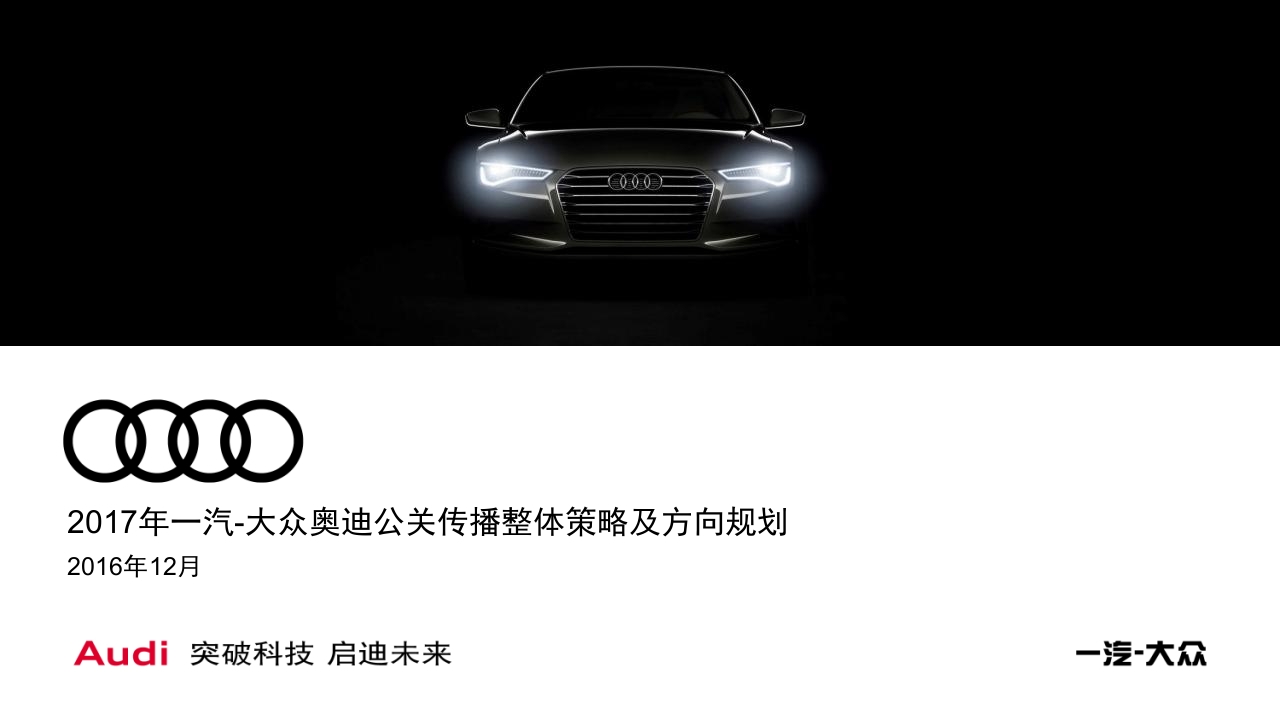 2017年一汽-大众奥迪公关传播整体策略及方向规划2016年12月Audi突破科技启迪未来目录1整体洞察及策略22017年公关传播规划3附录Audi突破科技启迪未来一汽大基本洞察一:碎片与整合》外部环境碎片化的媒体形态碎片化的阅读习惯使用顿次(指数)电视日到达率广电泡泡大小代表该类平媒介的日到达率110●70后2.99互联网日到达率75%87%媒体媒体●80后100●90后户外周到达率162%PC互三四线2.46联76%112%25%联网互联报纸日到达率媒体网媒90后2.57杂志月到达率4大类共24种媒体50广播日到达率80后2.7电影院月到达率1%37%超过80%的广告主会在一次典型营销活动中同时使用4.770后2.670%20%40%60%80%100%种以上的媒体。90100110120使用时间(指数)0■三四线■一二线主流媒体全国达到率主流媒体使用时长、频次及覆盖人群消费者日均接触媒体种类数量数据来源:群邑智库《2015媒介趋势报告》媒体越碎片化,传播越要整合化整合传播=信息的一致性+节奏的协同性+渠道的组合性·整合≠整齐划一,而是形散而神不散,是统一的核心信息在多样化平台上的多元映射