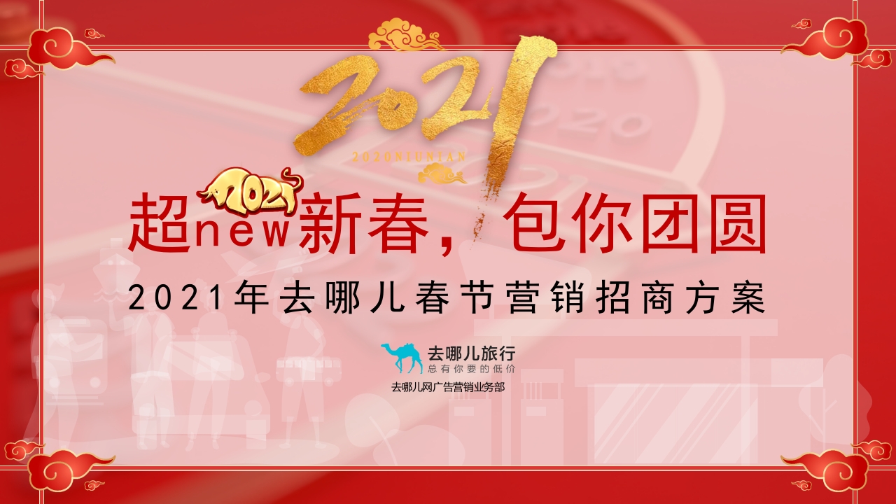2020NIUNIAN超新春,包你团圆2021年去哪儿春节营销招商方案去哪儿旅行去哪儿网广告营销业务部强价值,广覆盖2021年去哪儿春运,超NEW来袭30亿+6亿+20亿+超NEW规模超NEN覆盖超NEW生态史无前例出行人群出行生态大规模强客群全赋能超规模春运规模史无前例,营销节点不可错过受疫情阻隔,2020年春运旅客数腰斩,2021年逾30亿人次预将在春节出行。春运出行流量,史无前例。2019年春运旅客2020年春运旅客2021年预估春运旅客团圆只会迟到,不会缺席。29.8亿14.76亿30亿+30亿