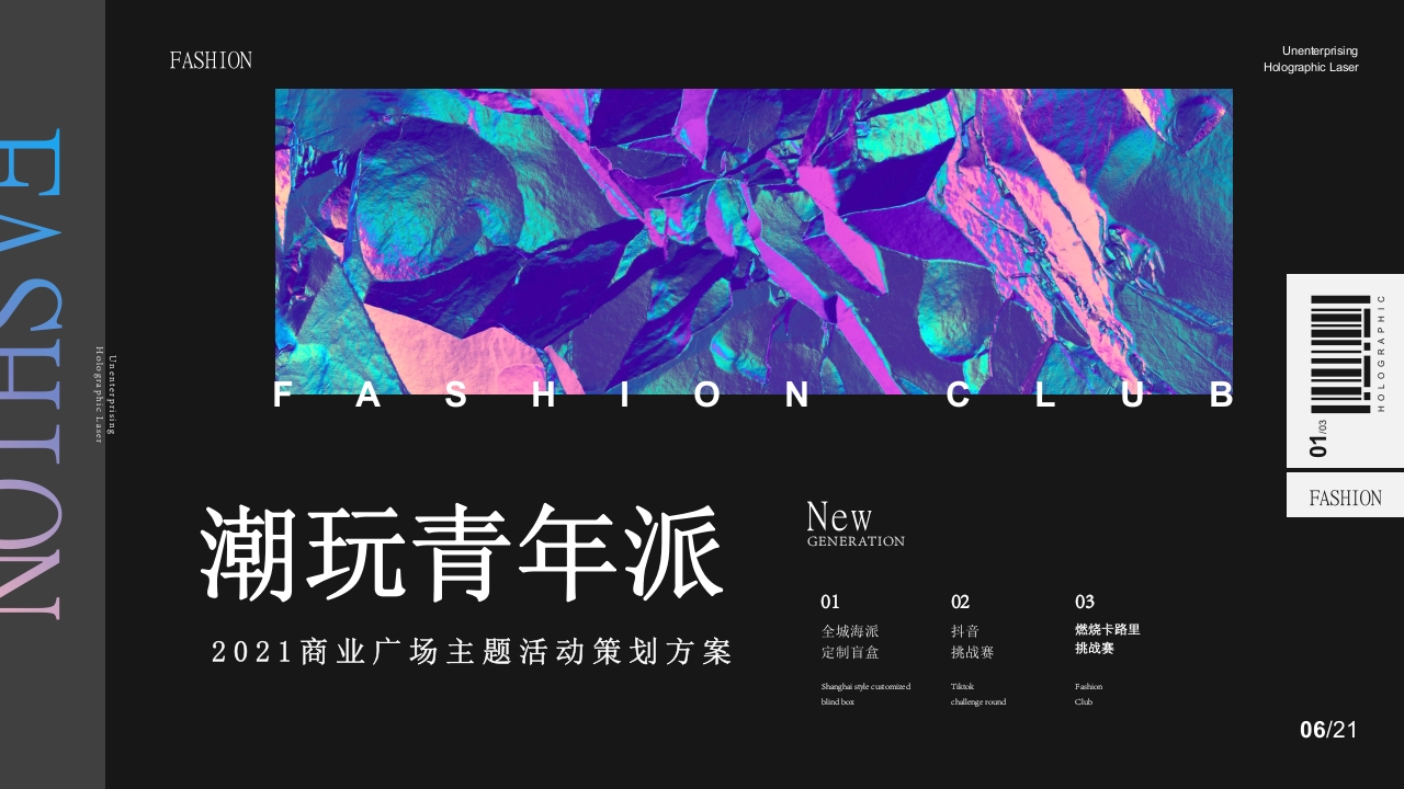 FASHIONUnenterprisingFASHION潮玩青年派NewGENERATION010203全城海派抖音燃烧卡路里2021商业广场主题活动策划方案挑战赛挑战赛06/21FASHIONUnenterprisingHolographic Laser01活动思路ACTIVITY IDEAS02方案附录APPENDIX TO THE活动亮点HIGHLIGHTS04活动规划03FASHION前期造势06/21FASHION活动思路HNBFASHION06/21