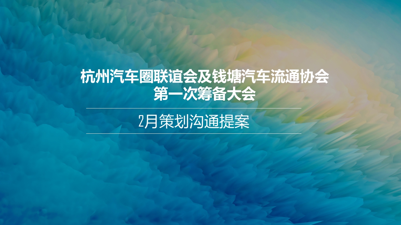 杭州汽车圈联谊会及钱塘汽车流通协会第一次筹备大会2月策划沟通提案杭州汽车圈联谊会及钱塘汽车流通协会第一次筹备大会活动时间:2022年2月下旬活动规模:邀请前期意向较强客户0人左右,研讨项目发展与未来活动主题:与你向前奔赴新程(备选主题:心悦亚运·拥抱热爱)