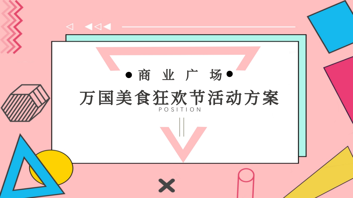 商业广场万国美食狂欢节活动方案POSITION0创意思路Creative thinking活动亮点Attraction of the ActivityCONTENTS03氛围包装Atmospheric Packaging04活动规划Activity planning●●●●●●●●●●01创意思