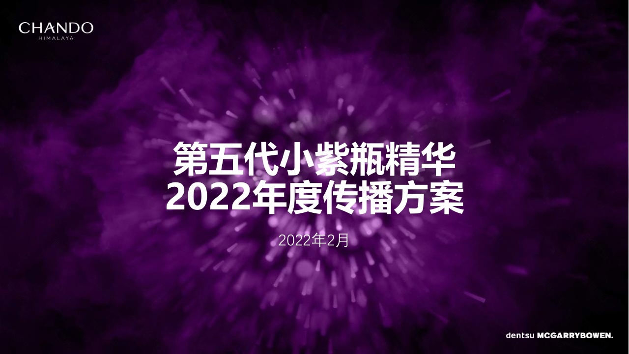 CHANDOHIMALAYA第五代小紫瓶精华2022年度传播方案2022年2月dentsu MCGARRYBOWEN.CHANDOHIMALAYA沟通需求回顾第一次提案:点亮熬夜肌,纵享我的液第二次提案:全面对抗熬夜肌(Integrated System,抗氧/抗糖/修复/维稳),全域击退熬夜肌,为肌肤补眠·本次要求:(1)概念诉求:成分+功效强调。成分以“喜默因”为主,功效“修复+抗氧化”:(2)传递“升级感”、“高端感”;(3)成分表达:极地酵母,新生,细胞级等词语,可以讨论后使用;(4)沟通人群:希望年轻化,沟通的适用性更为广泛。dentsu MCGARRYBOWEN.