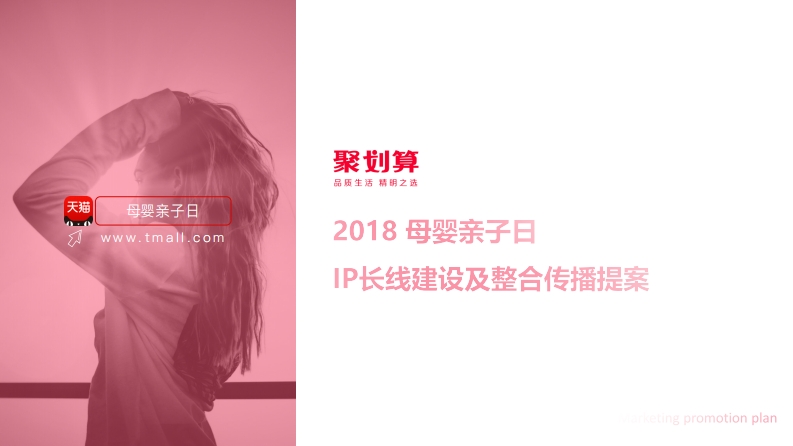 聚划算品质生话精阴之选天猫母婴亲子日www.tmall.com2018母婴亲子日IP长线建设及整合传播提案CONTENTS1、项目分析Project Analysis2、传播策略Broadcast strategy3、执行规划Project planning4、资源报价Resource quote目录2017年中国出生人口数量1723万,环比减少3.53%,国民生育意愿不强趋势萌发2002-2017年我国出生人口数变化1850■当年出生人口数万)0-年增长率(%)10.00%1,6.018008.00%17501.723.06.00%17001687.04.00%1,647.01,635.01,640.01.655.0●16501611.01599.01593.01,59.1,608.01,604.02.00%1,592.016001,585.01,5911939%0.00%1.13%0.63%082%●075%031%15500.38%-2.00%1.06%61%1500-4.00%-291%1450-6.00%2002200320042005200620072008200920102011201220132014201520162017B Analysys易观·国家统计局2017年全年出生人口1723万人,人口出生率为12.43%,环比减少3.53%,比2016年少出生63万人。在去年的出生人口中,二孩占占比50%以上,比2016年提高了10个百分点。母婴行业人口红利减小,但由于二孩比例增大,可以预见,未来几年经济条件较强的二孩家庭将成为母婴市场的消费主力,母婴市场的中高端领域将持续扩大