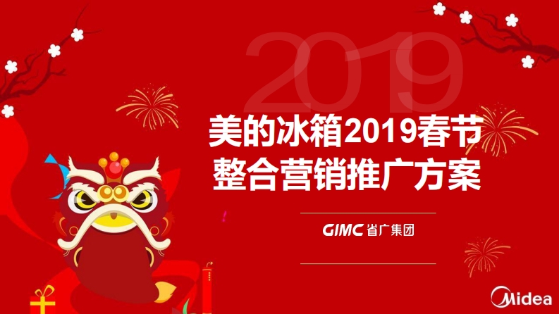 美的冰箱2019春节养整合营销推广方案GIMC省广集团Midea春节是中国人最重视的传统节日3.8272%亿72%的中国人一定要回家过年铁路共发送旅客3.82亿人次春节是中国人最深的情感牵绊,无论多远都要过年同时,春节更是场全民的消费狂欢9,260亿84.9万全国零售餐饮销售额移动互联网流量TB57.23亿春节档电影票房刷新123.7亿条全国移动短信发送量4,750亿春节旅游收入2,297亿条微信发送总量