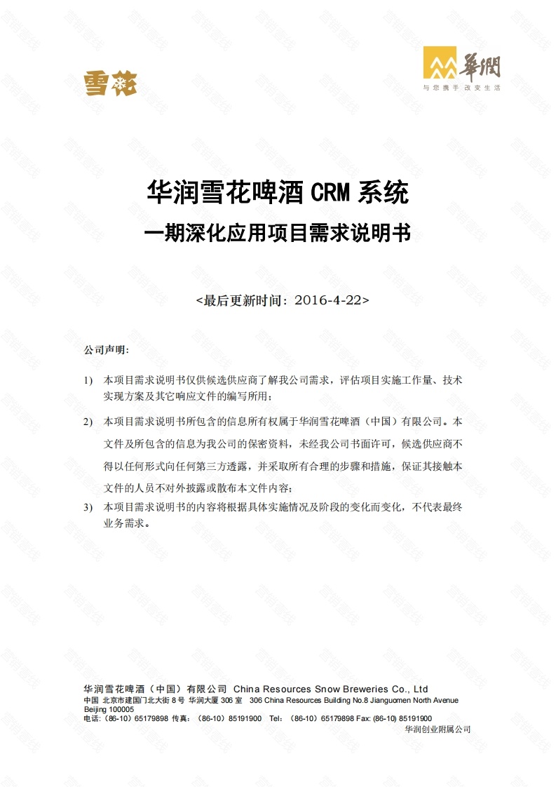 与您携手改变生活华润雪花啤酒CRM系统一期深化应用项目需求说明书<最后更新时间:2016-4-22>公司声明:1)本项目需求说明书仅供候选供应商了解我公司需求,评估项目实施工作量、技术实现方案及其它响应文件的编写所用:2)本项目需求说明书所包含的信息所有权属于华润雪花啤酒(中国)有限公司。本文件及所包含的信息为我公司的保密资料,未经我公司书面许可,候选供应商不得以任何形式向任何第三方透露,并采取所有合理的步骤和措施,保证其接触本文件的人员不对外披露或散布本文件内容:3)本项目需求说明书的内容将根据具体实施情况及阶段的变化而变化,不代表最终业务需求。华润雪花啤酒(中国)有限公司China Resources Snow Breweries Co.,Ltd中国北京市建国门北大街8号华润大厦306室306 China Resources Building No.8 Jianguomen North AvenueBeijing 100005电话:(86-10)65179898传真:(86-10)85191900Tel:(86-10)65179898Fax(86-1085191900华润创业附属公司与您携手改变生活目录1公司简介与项目背景2.1系统业务需求2.2系统设计概念的友好性2.3系统设计的逻辑性和可配置性2.4系统数据的实时性2.5系统设计应具有前瞻性、拓展性、灵活性72.6系统集成性83项目实施组织范围与规模预测-本期项目范圈84CRM一期功能和深化应用功能模块概述94.1CRM一期项目功能与架构简介94.2CRM一期深化应用功能模块概述5CM一期优化功能需求-本期项目范围5.1移动APP功能优化5.2BI技术架构调整135.3新需求整合与重构136业务需求说明本期项目范圈6.1终端覆盖、控店与工作计划管理6.1.1建设思路如下图.…146.1.2重点业务功能点思路156.2协议终端及费用管理166.2.1建设思路如下图6.2.2重点业务功能点思路166.3阶段性促销及费用管理186.3.1建设思路如下图196.3.2重点业务功能点思路6.4手机移动端督导(检查)管理206.4.1建设思路如下6.4.2重点业务功能点.…216.5销售费用管理模块华润雪花啤酒(中国)有限公司China Resources Snow Breweries Co.,Ltd中国北京市建国门北大街8号华润大厦306室306 China Resources Building No.8 Jianguomen North AvenueBeijing 100005电话:(86-10)65179898传真:(86-10)85191900Tl:(86-10)65179898Fax:(86-1085191900华润创业附属公司