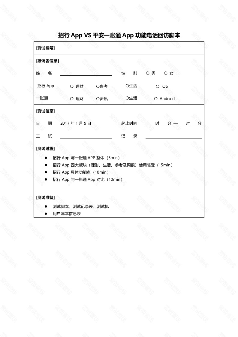 招行App VS平安一账通App功能电话回访脚本[测试编号】[被访者信息]名性别招行App一账通O Android[测试信息】日期2017年1月9日起止时间时分一时分主试记录[测试过程]·招行App与一账通APP整体(5min)·招行App四大板块(理财、生活、参考及网银)使用感受(15min)招行App具体功能点(10min)招行App与一账通App对比(10min)[测试准备]测试脚本、测试记录表、测试机用户基本信息表电话回访(共40min)一、招行网银APP和一账通APP整体使用感受(10min)1.1我们已经了解到您是招行网银App用户,您大致的使用频率是怎样的,(提示:一个月使用多少次)?每天一次以上1三周1次6每周4-5次2一月1次7每周2-3次3两月1次8每周1次4三月1次9两周1次5多于三月1次101.2您用过招行网银App哪些功能,一般最常用哪些功能,近两周用过哪些功能?【注:记录理财、参考、生活、网银功能用户,在“二、”中详细询问】开放题?→就招行网银App整体而言,您使用感受如何?1-10分打分,10分为非常满意。打分好的地方:不好的地方:在近两周使用过程中遇到过什么问题吗?当时怎么解决的?