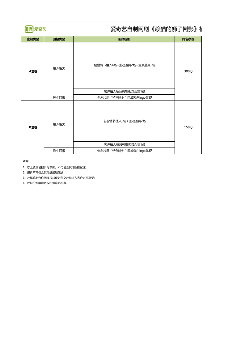 首页行业工具表格模板广告报价-爱奇艺S级网剧《赖猫的狮子倒影》植入报价方案