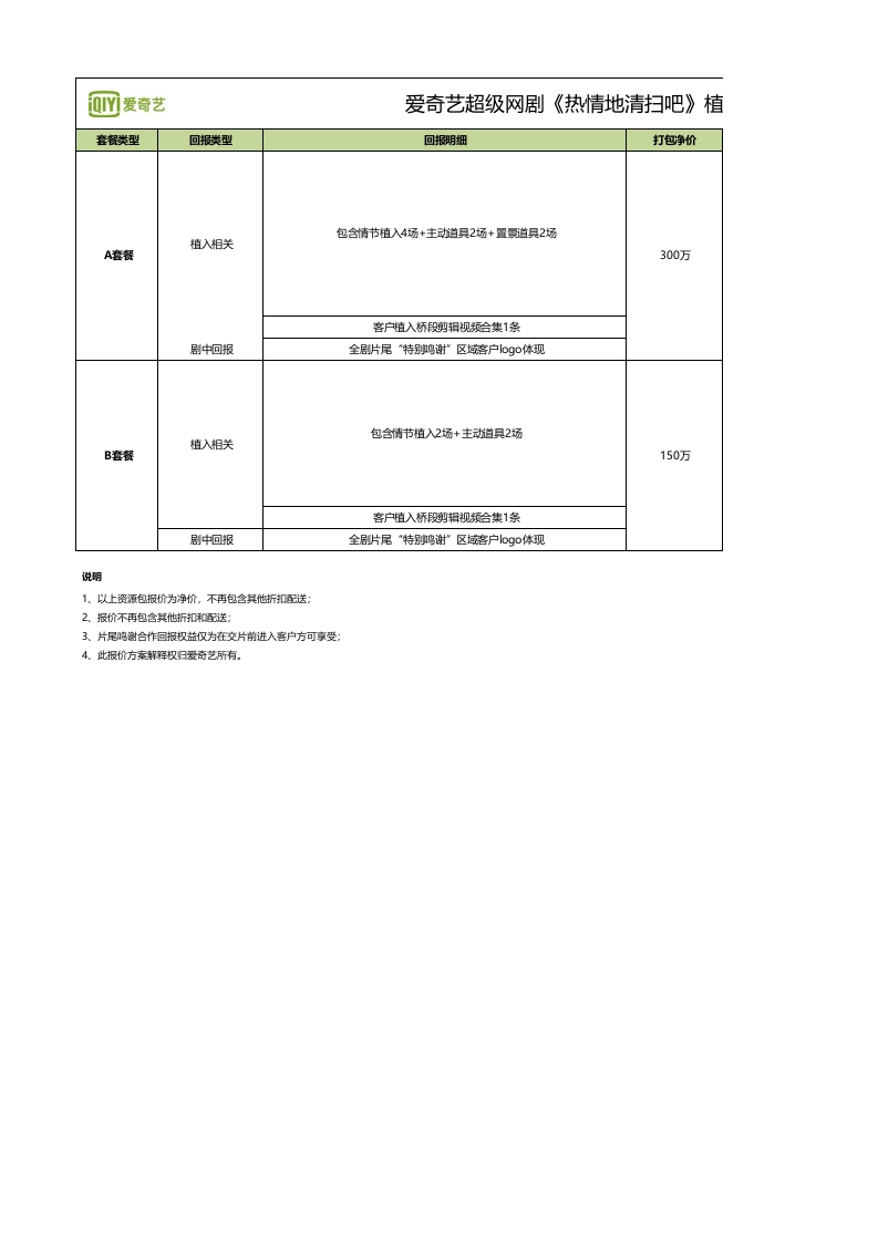 首页行业工具表格模板广告报价-爱奇艺超级网剧《热情的清扫吧》植入报价
