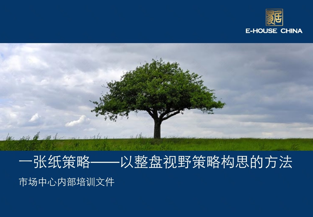E-HOUSE CHINA张纸策略以整盘视野策略构思的方法市场中心内部培训文件E-HOUSE CHINA所谓一张纸策略是全局思考与提高沟通效率有力工具以价值实现为营销目的的思考发■1、价值实现的市场机会与障碍■2、项目价值与难点价位■3、区域价值与难点■对项目建立正面的价值观是我们做营销动作的思维定位起点,通过整合思考,以系统的策略排除困难,实现价值是我们的最终目的。创作■全局思考,有力预想后手动作卡■1、包含市场分析■2、项目定位,客户定位,价格定位3、以及相应的衍生策略■作为前期策划人员,应当具有良好的分析,整合以及策略构思能力,通过经验与逻辑的合理运用,塑造整盘的策略格局。