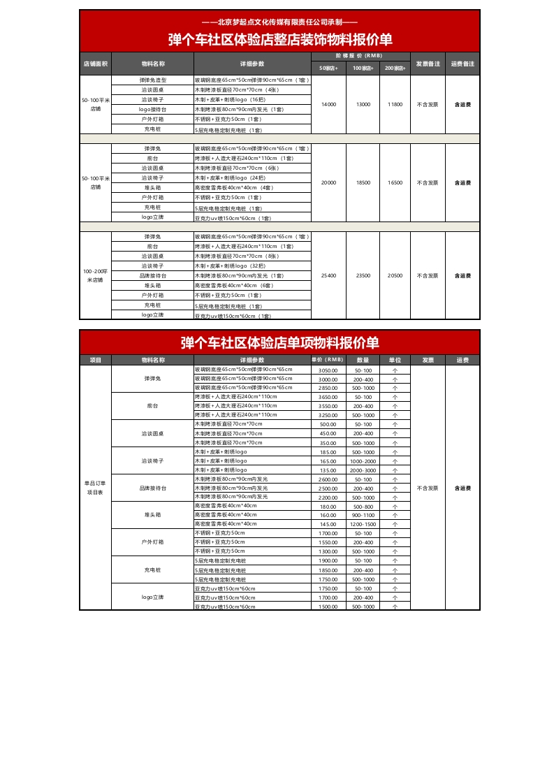北京梦起点文化传煤有限责任公司承制一一弹个车社区体验店整店装饰物料报价单200南+0-100平米140001300011800含运费户外灯箱不锈+亚克力50cm(1套》充电桩前台50100平米2000016500含运费户外灯箱前台100200平2540020500含运费堆头箱户外灯箱充电桩弹个车社区体验店单项物料报价单单位305000个个285000s00-1000个3650.0050-100个前台200-400个个50-10045000200-400个个18500个165.002000-3000个单品订单2600.00个200400个含运费220000s00-1000个高密雪井板40m*40m个16000g00-1100个145.001200-1500个不锈钢+亚克力50cm1700.00个户外灯箱不锈钢+亚克力50cm1550.00200-400个不锈钢+亚克力50cm个1900.0050-100个185000200-400个1750001000个170000200-400个150000500-1000个
