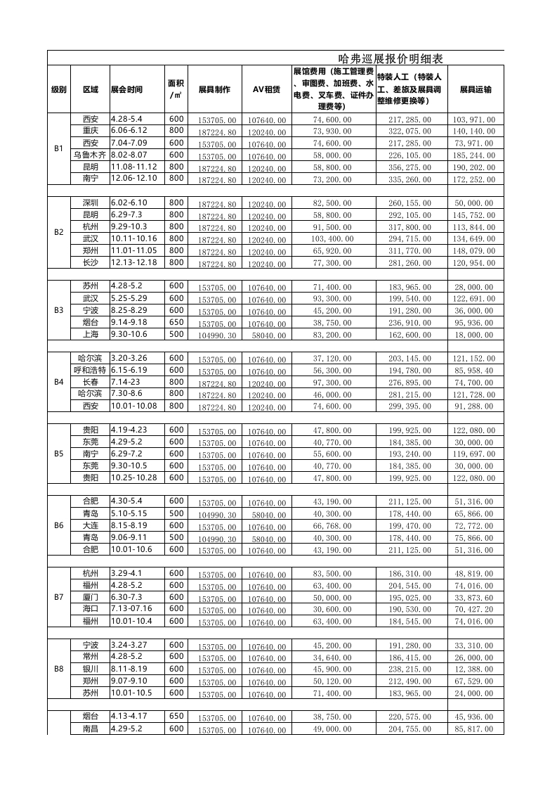 哈弗巡展报价明细表展馆费用(施工管理费特装人工(特装人面积审图费、加班费、水级别区域展会时间/m展具制作AV租赁电费、又车费、证件办工、差旅及展具调展具运输整维修更换等)理费等)西安4.28-5.4600153705.00107640.0074.600.00217,285.00103,971.00重庆6.06-6.12800187224.80120240.0073.930.00322,075.00140,140.00西安7.04-7.0960074,600.00217,285.0073,971.00B1153705.00107640.00乌鲁木齐8.02-8.07600153705.00107640.0058.000.00226,105.00185,244.00昆明11.08-11.12800187224.80120240.0058.800.00356,275.00190,202.00南宁12.06-12.10800187224.80120240.0073.200.00335,260.00172,252.00深圳6.02-6.10800187224.80120240.0082.500.00260,155.0050,000.00昆明6.29-7.3800187224.80120240.0058,800.00292,105.00145,752.00B2杭州9.29-10.3800187224.80120240.0091.500.00317,800.00113,844.00武汉10.11-10.16800187224.80120240.00103.400.00294,715.00134,649.00郑州11.01-11.05800187224.80120240.0065,920.00311,770.00148,079.00长沙12.13-12.18800187224.80120240.0077.300.00281.260.00120,954.00苏州4.28-5.2600153705.00107640.0071.400.00183,965.0028,000.00武汉5.25-5.29600153705.00107640.0093,300.00199,540.00122,691.00B3宁波8.25-8.29600153705.00107640.0045.200.00191,280.0036,000.00烟台9.14-9.18650153705.00107640.0038.750.00236.910.0095,936.00上海9.30-10.6500104990.3058040.0083.200.00162,600.0018,000.00哈尔滨3.20-3.26600153705.00107640.0037,120.00203,145.00121,152.00呼和浩特6.15-6.19600153705.00107640.0056.300.00194,780.0085,958.40B4长春7.14-23800187224.80120240.0097.300.00276,895.0074,700.00哈尔滨7.30-8.6800187224.80120240.0046,000.00281.215.00121,728.00西安10.01-10.08800187224.80120240.0074,600.00299,395.0091,288.00贵阳4.19-4.23600153705.00107640.0047.800.00199.925.00122.080.00东莞4.29-5.2600153705.00107640.0040.770.00184.385.0030,000.00B5南宁6.29-7.2600153705.00107640.0055,600.00193,240.00119,697.00东莞9.30-10.5600153705.00107640.0040,770.00184,385.0030,000.00贵阳10.25-10.28600153705.00107640.0047,800.00199,925.00122.080.00合肥4.30-5.4600153705.00107640.0043,190.00211,125.0051,316.00青岛5.10-5.15500104990.3058040.0040,300.00178,440.0065,866.00B6大连8.15-8.19600153705.00107640.0066,768.00199,470.0072,772.00青岛9.06-9.11500104990.3058040.0040,300.00178,440.0075,866.00合肥10.01-10.6600153705.00107640.0043.190.00211,125.0051,316.00杭州3.294.1600153705.00107640.0083.500.00186,310.0048,819.00福州4.28-5.2600153705.00107640.0063.400.00204.545.0074,016.00B7厦门6.30-7.3600153705.00107640.0050.000.00195,025.0033,873.60海口7.13-07.16600153705.00107640.0030.600.00190,530.0070,427.20福州10.01-10.4600153705.00107640.0063,400.00184,545.0074,016.00宁波3.24-3.27600153705.00107640.0045,200.00191,280.0033,310.00常州4.28-5.2600153705.00107640.0034.640.00186,415.0026,000.00B8银川8.11-8.19600153705.00107640.0045,900.00238,215.0012,388.00郑州9.07-9.10600153705.00107640.0050.120.00212,490.0067,529.00苏州10.01-10.5600153705.00107640.0071.400.00183.965.0024.000.00烟台4.13-4.17650153705.00107640.0038.750.00220,575.0045,936.00南目4.29-5.2600153705.00107640.0049,000.00204,755.0085,817.00B9郑州6.08-6.11600153705.00107640.0050.120.00212,490.0067,529.00临沂9.02-9.5600153705.00107640.0038.750.00203,005.0050,408.00南京9.30-10.5600153705.00107640.0048,400.00191,315.0066,766.00天津4.28-5.3600153705.00107640.0063.220.00185,015.0030.000.00沈阳6.14-6.19600153705.00107640.0059.380.00195.620.0055,356.00B10天津10.01-10.6600153705.00107640.0063.220.00185,015.0030,000.00沈阳10.18-10.23600153705.00107640.0059,380.00195,620.0055,356.00哈尔滨11.20-11.26600153705.00107640.0037.120.00203.145.0091,152.00绵阳4.18-4.22500104990.3058040.0043.520.00193.150.0080,988.00兰州4.27-5.2500104990.3058040.0051,500.00190,240.0073,206.00C1太原8.31-9.3500104990.3058040.0074.500.00181.090.0099,564.809.12-9.17500104990.3058040.0054.850.00181.930.0062,661.60深圳10.01-10.6600119568.5058040.0082.500.00200,960.0091,217.60包头4.29-5.3600119568.5058040.0039,200.00175,830.0034,065.00兰州8.23-8.28500104990.3058040.0051.500.00181.000.0065,418.00包头9.13-9.17500104990.3058040.0039.200.00152,140.0055,549.00西宁9.30-10.8600119568.5058040.0051,550.00191,895.00123,587.00绵阳11.08-11.12500104990.3058040.0043,520.00183,610.00122,193.00临沂4.06-4.8500104990.3058040.0038.750.00158.290.0042.806.00石家庄4.29-5.02500104990.3058040.0038.750.00158.290.0032,806.00义乌5.17-5.20500104990.3058040.0046,650.00146,980.0092,013.00C3洛阳9.21-9.24600119568.5058040.0038,750.00197,075.00101,456.00南昌10.01-10.4600119568.5058040.0039,500.00184.755.0075,817.00义乌11.16-11.19500104990.3058040.0046.650.00146,980.00122,013.00泉州4.28-5.1600119568.5058040.0039,000.00186,610.0087,457.00无锡8.30-9.03600119568.5058040.0056.500.00165,365.0030,000.00C4长沙9.13-9.17600119568.5058040.0071.300.00194.660.0092.732.00常州9.30-10.4600119568.5058040.0034,640.00166,415.0030,000.00重庆10.26-10.29600119568.5058040.0054,932.50196,865.00114,067.00永康4.21-4.23500104990.3058040.0040.980.00149,140.0048,587.00盐城4.29-5.02500104990.3058040.0047,400.00152.620.0068,855.00绍兴9.01-9.04500104990.3058040.0029.400.00145,150.0038,881.00盐城9.21-9.25500104990.3058040.0047,400.00152,620.0068,855.00泉州9.30-10.3500104990.3058040.0042.000.00161.380.0085,593.00嘉兴10.28-10.31500104990.3058040.0054.550.00141.910.0038,338.00小计税费总价最终优惠报价657201.0039432.06696633.06696000.00843609.8050616.59894226.39894000.00627201.0037632.06664833.06664000.00730694.0043841.64774535.64774000.00912741.8054764.51967506.31967000.00888176.8053290.61941467.41940000.004935000.00700119.8042007.19742126.99742000.00804121.8048247.31852369.11852000.00830608.8049836.53880445.33880000.00840228.8050413.73890642.53890000.00833233.8049994.03883227.83882000.00786978.8047218.73834197.53834000.005080000.00544710.0032682.60577392.60577000.00676876.0040612.56717488.56717000.00533825.0032029.50565854.50565000.00632941.0037976.46670917.46670000.00426830.3025609.82452440.12452