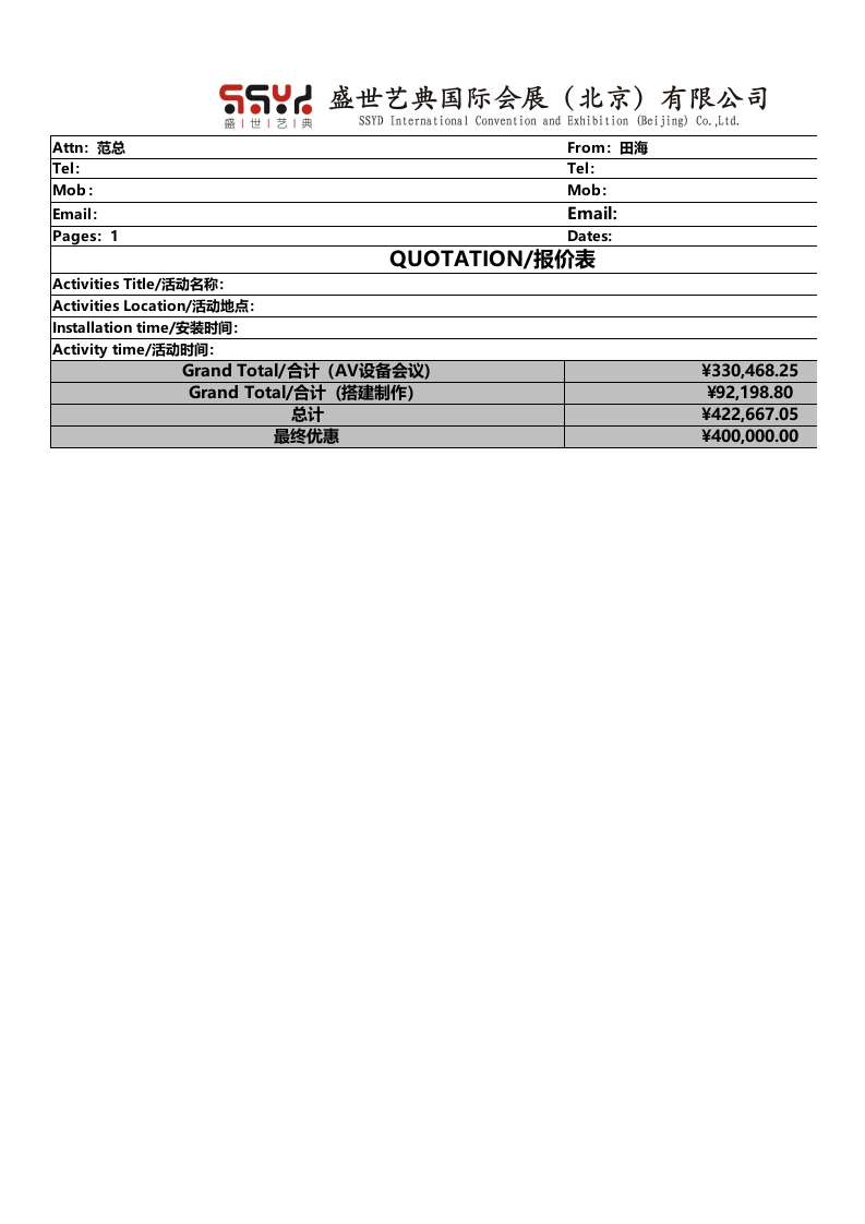 盛世艺典国际会展(北京)有限公司SSYD International Convention and Exhibition (Beijing)Co.Ltd.Attn:范总From:田海Tel:Tel:Mob:Mob:Email:Email:Pages:1Dates:QUOTATION/报价表Activities Title/活动名称:Activities Location/活动地点:Installation time/安装时间:Activity time/.活动时间:Grand Total/合计(AV设备会议)¥330,468.25Grand Total/合计(搭建制作)¥92,198.80总计¥422,667.05最终优惠¥400,000.00盛世艺典国际会展(北京)有限公司SSYD International Convention and Exhibition (Beijing)Co.,Ltd.Attn:范总From:田海Tel:Tel:Mob:Mob:Email:Email:Pages:1Dates:QUOTATION/报价表Activities Title,/活动名称:Activities Location/话动地点:西安陕西宾馆Installation time/安装时间:Activity time/,话动时间:A、AV equipment/AV设备A1、Audio equipment/音频设备DescriptionQTY Units DaysADAMSON S10线性阵列全频音箱16只ADAMSON S119线性阵列超低音音箱81L-acoustics X15HiQ前区补声全频音箱6只1L-acoustics X15HiQ舞台监听全频音箱8只ADAMSON12K44功率放大器4台L-acoustics LA8功率放大器台DiGiCo SD10数字调音台张DiGiCo SD Rack数字接口箱1台LIGTWARE110光纤传输4套SHURE UR4D+BETA58A无线手持话筒6支MAC book pro音乐播放电脑1台Sound card RME-FirefaceUC(SUBcompct)声卡台SHUER MX412D/C讲台麦支DBX4880数字音频处理器1台SANTAK三相五线制数字配电柜1台A2、Light equipment/灯光设备DescriptionQTY Units DaysACME LED四眼观众灯4台GTD1500ⅡPROFILE电脑成像灯16台GTD330Ⅱ三合一电脑灯76台Omarte LEADER5484100台10 marte Gatling1500图案电脑灯2台1Malighting MA2调光台1台MA NPU1台TRUSS架142米雷亚架550根LIGHTING Pdu-60信号放大器2台SANTAK三相五线制数字配电柜2台1A3、Video equipment/视频设备DescriptionQTY Units DaysGLOSHINE P3500mm×500mm室内LED显示屏(W15mxH6.5m)主屏幕97.2mGLOSHINE P3500mm×500mm室内LED显示屏(W5mxH6.5mx2组)侧屏65m1Magnimage LED-590LED控制器8台1Apple Macbook Pro苹果工作站2台