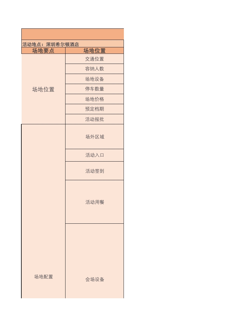 活动地点:深圳希尔顿酒店场地要点场地位置交通位置容纳人数场地设备场地位置停车数量场地价格预定档期活动报批场外区域活动入口活动签到活动用餐场地配置会场设备化妆间嘉宾休息室杂物间物料卸货通道场地货梯场地电箱卸货停车场图文打印超市及商场鲜花店周边配套照片冲印店医院派出所活动场地选活动时间:2019年10月1日场地选址注意事项1场地交通位置便利(是否靠地铁站、高铁机场、码头、城市市中心等)2场地面积+常规容纳人数+最大容纳人数,座位材质,座位间隔、座位舒适度3.活动整体设备检查(大屏+主舞台+音响),是否满足活动基础需求4.停车位数量,停车收费情况,限高(搭建)5场地价格与周边对比如何?包含哪些设备和配套?拿到最低报价6.提前一个月预定,交5000押金,签署场地合同7是否可以配合主办方进行公安/消防等材料申报?是否收费?报批周期大概多少?1是否可以摆放及活动搭建制作物料2.是否配备遮阳物料,防止观众入场被晒3是否有备用电源,足够支持多久4.是否有汽车下客区(还是必须在停车场)1场地入口结构是否适合签到,摆放宣传物料及悬挂条幅2.入口数量及位置,客梯位置及数量1嘉宾签到合位置,数量(公众号:营销星球)2是否可以摆放背板及材质(公众号:营销星球)3距离场地前台及衣帽间,电梯,卫生间,餐厅,会场的距离1.餐厅位置是否便利2餐厅营业时间,是否可以延长(公众号:营销星球)3.餐厅最多容纳多少人同时用餐4.是否可以提供独立区域服务本次活动5.餐厅菜系、费用、是否提供自助餐6.是否可以自带酒水是否增收开瓶费7.是否可以开活动餐饮发票1.主会场位置,入口数量,尺寸长宽灯下高,是否有柱子2主会场是否有吊点、吊点数量及单根承重3.是否有投影幕及音响设备,如果是LED,要了解尺寸及分辨率4.投影幕布尺寸,投影机流明5.音响数量,类型,位置,麦克风数量6讲台样式及尺寸,地台样式,尺寸及数量9.灯光开关位置,是否可以分开控制10.安全出口位置及数量,员工通道入口及上菜口12.同一档期是否有其他公司预定,是否有友商的活动13WIFI速度及强度,是否可免费提供独享带宽(公众号:营销星球)14.场租包含的具体会议物品,如鲜花,纸笔水等15.空调温度变化控制的时长,开关位置