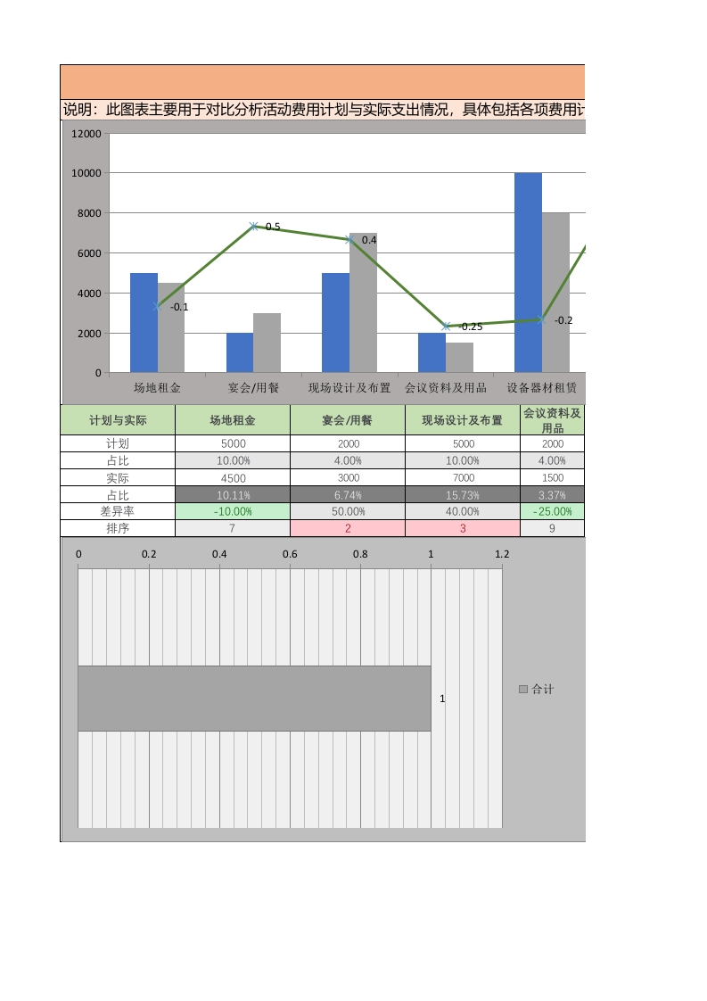 说明:此图表主要用于对比分析活动费用计划与实际支出情况,具体包括各项费用12000100008000米0.50.4600040000.2←0.2520000场地租金宴会用餐现场设计及布置会议资料及用品设备器材租赁计划与实际场地租金宴会/用餐现场设计及布置会议资料及用品计划5000200050002000占比10.00%4.00%10.00%4.00%实际450030007000150010.11%6.749%15.73%3.37%差异率-10.00%50.00%40.00%-25.00%排序72390.20.40.60.811.2口合计活动费用计划与实际对比分析表(通用版)划与实际差异情况、各项费用占比情况。此图标适合各类活动。(所列费用项目仅供参考00.250.33333333-0.375会议礼品影视录音速记翻译会议用食品、点心嘉宾费用媒体费用住宿费用设备器材租影视录音速会议用食品赁会议礼品嘉宾费用媒体费用住宿费用交通费用办公费用记翻译、点心100001000200030008000500030002000200020.00%2.00%4.00%6.00%16.00%10.00%6.00%4.00%4.00%80002000150020005000500020002000100017.98%4.49%3.379%4.49%11.249%11.24%4.49%4.49%2.25%-20.00%100.00%-25.00%-33.33%-37.50%0.00%-33.33%0.00%-50.00%8191113511514交通费用,0.044942608场地租金,0.10112媒体费用,0.11235宽费用,0.044942608宴会/用餐嘉宾费用,0.112356521现场设计及布置,d(万元)议会议用食品、点心,0.044942608会议礼品,0.044942608影视录音速记翻译,0.033706956设备器材租赁,0.179770表格中含自动计算公式,颜色标注部分无需录入数据)マ0.80.60.4计划0.2-0.2实际0-0.233333333-0.4-0.5-0.6交通费用办公费用其它成本合计(万元)50001100.00%44501.2100.00%-11.00%08690.0674139120.157299129资料及用品,0.0337069560433