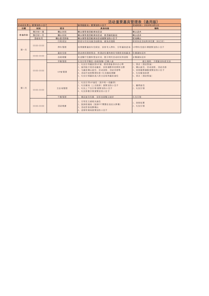活动重要嘉宾管理表(通用版)活动时日:2019年10月1日倒计时一周确认话术倒计时一天确认话术活动当天行程规划0000-0000停车管理第一天位置通话术0000-0000白助晚餐会餐通知话术2骑认座位、活动流程、活动内0000-00003、礼饮催场协调第二天0000-00001财务结算0000-0000活动劳务结算确认3、小文老师接机提前安持车提前发送电子板始司机询同是否有忌口成者有其它要求在此期同防止外部人员打扰技用礼饮培训单执行即可