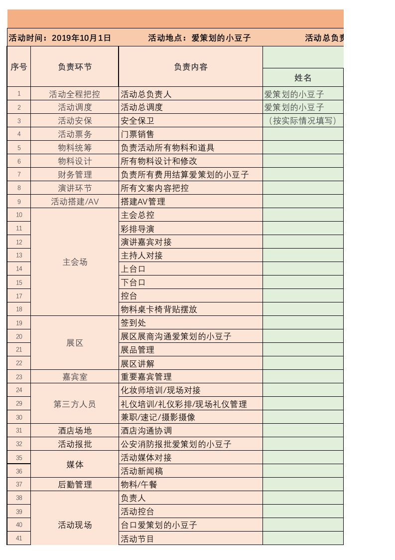 活动时间:2019年10月1日活动地点:爱策划的小豆子序号负责环节负责内容姓名1活动全程把控活动总负责人爱策划的小豆子2活动调度活动总调度爱策划的小豆子3活动安保安全保卫(按实际情况填写)4活动票务门票销售5物料统筹负责活动所有物料和道具6物料设计所有物料设计和修改7财务管理负责所有费用结算爱策划的小豆子8演讲环节所有文案内容把控9活动搭建/AV搭建AV管理10主会总控11彩排导演12演讲嘉宾对接13主会场主持人对接1415下台口17控台18物料桌卡椅背贴摆放19签到处20展区展商沟通爱策划的小豆子展区21展品管理22展区讲解23嘉宾室重要嘉宾管理24化妆师培训/现场对接29第三方人员礼仪培训/礼仪彩排/现场礼仪管理30兼职/速记/摄影摄像31酒店场地酒店沟通协调32活动报批公安消防报批爱策划的小豆子媒体活动媒体对接36活动新闻稿37后勤管理物料/午餐38负责人39活动控台40活动现场台口爱策划的小豆子41活动节目昏人:爱策划的小豆子乙方执行负责人电话Tel邮箱爱策划的小豆子爱策划的小豆子爱策划的小豆子爱策划的小豆子(按实际情况填写)(按实际情况填写)舌动人员现场联系表(通用版)注:如遇紧急情况找不到人影响活动进度,请与总负相关配合负责人(含甲方万相关人员姓名电话Tel团队2人爱策划的小豆子123456789团队3人爱策划的小豆子123456789(按实际情况填写)(按实际情况填写)(按实际情况填写)