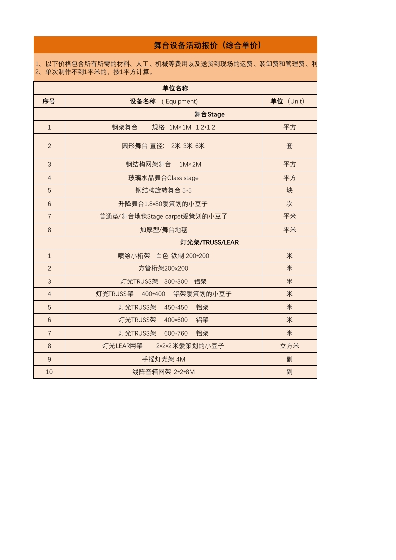 舞台设备活动报价(综合单价)1、以下价格包含所有所需的材料、人工、机械等费用以及送货到现场的运费、装卸费和管理费、利2、单次制作不到1平米的,按1平方计算。单位名称序号设备名称(Equipment)单位(Unit)舞台Stage1钢架舞台规格1M×1M1.2*1.2平方圆形舞台直径:2米3米6米套3钢结构网架舞台1M×2M平方4玻璃水晶舞台Glass stage平方5钢结构旋转舞台55块6升降舞台1.8*80爱策划的小豆子次7普通型舞台地毯Stage carpet爱策划的小豆子平米8加厚型/舞台地毯平米灯光架/TRUSS/LEAR1喷绘小桁架白色铁制200*200米2方管桁架200x200米3灯光TRUSS架300300铝架米4灯光TRUSS架400*400铝架爱策划的小豆子米5灯光TRUSS架450*450铝架米6灯光TRUSS架400*600铝架米7灯光TRUSS架600*760铝架米灯光LEAR网架2*2*2米爱策划的小豆子立方米9手摇灯光架4M副10线阵音箱网架2*2*8M副润和税费等全部费用综合单价55/f(1200起)2m-6003m-8006m-150055/f(1200起)802400/次182412/m(600起/套)12/m(600起/套)55657524240800灯光设备活动报价(综合单价)1、以下价格包含所有所需的材料、人工、机械等费用以及送货到现场的运费、装卸费和管理费、利润和帮2、单次制作不到1平米的,按1平方计算。单位名称序号设备名称(Equipment),单位(Unit)灯光设备(Lighting Equipment))一、电脑摇头/光束灯系列1电脑摇头图案灯YAFENG-1200SPOT台电脑摇头染色灯YAFENG-1200WASH3电脑光束灯JOLLY-300W4电脑摇头图案灯珠江PR-2910SPOT5电脑光束灯珠江PR-2203BEAM200W台6电脑光束灯珠江PR-5000BEAM1500W二、追光灯系列7追光灯Followspot1500w8追光灯Followspot2500w9追光灯Followspot4000w三、常规灯具系列10PAR灯MONON-PA641000W台11回光灯MONON2KW台12地排灯MONON2KW13成像灯魔龙-750 W OSRAN14ETC多功能PA灯魔龙-750 OSRAN15四眼观众灯Four audience lights16八眼观众灯Eight audience lights17AC灯AC lamp500W4个/组组18AC灯AC lamp250W8个/组组19车展/展览PAR灯Motor Show lights150W台四、LED灯具系列20LED PA灯YAFENG54*3W21LED灯带LED lights with米五、激光特效灯具系列22单绿激光灯Single green laser light10oMW台23单绿激光灯Single green laser light1W(电脑编程)24单绿激光灯Single green laser light2W(电脑编程)25全彩动画激光灯Single green laser light1W(电脑编程)台26全彩动画激光灯Single green laser light2W(电脑编程)台
