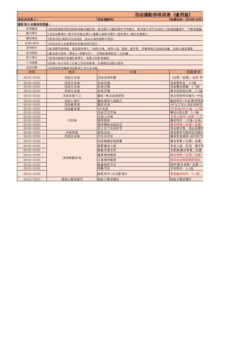 活动摄影师培训表(通用版)活动总负责人:活动摄影师:拍摄时间:2019年10月摄影照片关键流程提醒:流程解说1提前给摄影师按流程单讲解关键流程,重点提示关键拍照环节和镜头,要求每个环节必须有35张高质量照片,不要求数量重点照片2活动全景照片+每个环节亮点照片+重要人物特写照片+签到照片+舞合空镜照片:精影抓拍3签到/观众席提问互动抓拍,观众认真观看特写抓拍:主持人照片4活动主持人及重要演员和嘉定特写照片:金句抓拍6嘉宾金句抓拍(要求人+屏幕文字),后期处理要形成二次传播:工作场景8拍摄一些公司员工认真工作的场景照,后期做活动简介使用活动合影9活动结来拍摄领导合影和工作人员合影时间地点拍摄要求0000-0000活动主会场活动会场布置(近景/远景,必须带0000-0000活动主会场0000-0000活动主会场会场空境0000-0000活动主会场会场空境舞台反拍观众席:3-5张0000-0000活动会场门口嘉宾+观众进场签到观众签到特写镜头+中远0000-0000活动入场口嘉宾领导入场照片0000-0000活动嘉宾席嘉宾交流VP与工作人员交流特写0000-0000活动嘉宾席VIP交流0000-0000活动正式开场舞台&观众席:3-5张0000-0000主持人开场主持人特写+全量:350000-0000主会场0000-0000领号导集体启动仪式舞台背景/近景/远景:0000-0000台上台下互动环节观众提问等,观众远景利0000-0000中场休息抓怕交流抓怕领导与领导交流照片0000-0000活动分会场分论坛讨论嘉宾发表演讲+金句环书0000-0000活动晚宴会场装置舞台背景/近景/远景)0000-0000重要嘉宾入场来宾入场,交流捏手等0000-0000晚宴开场节目光影画(舞台背景/近景0000-0000重要领号致辞舞台背景/近景/远景)0000-0000活动晚宴会场0000-0000晚宴特色节目相声(舞台背景/近景/0000-0000伴餐节目节目特写:3-5张0000-0000获奖嘉宾特写:3-5张0000-0000按自己要求填写按自己要求填写按自己要求填写日上午08:00一下午18:00活动地点:一定要求质量:方案名称和L0G0:3-5张景:3-5张5-10张各种指示系统+装饰:35张:3-5张3-5张3-5张活动人群合影3-6张,工作人员合影3-6涨