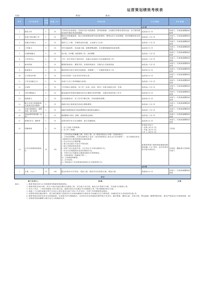 运营企划策划绩效考核表