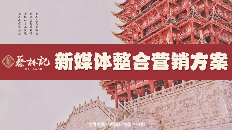 全维度整合言销传播服务机构项目背景口项目背景与合作目标品牌背景brand background“蔡林记“字号始创于1928年。历经几代蔡林记人的创业拼搏,蔡林记由单一的面馆发展为生产多样化特色小吃产品的餐饮品牌企业,成为武汉市及荆楚大地家喻户晓的百年老字号小吃品聘,上个世纪20年代末,第一家店在汉口满春路开张营业,因门前两颗葱郁的大树,取名‘蔡林记”,寓意生意兴隆,财源茂盛。1955年,蔡林记由私营改造成公私合营企业,店面扩大后生意蒸蒸日上。1966年起,蔡林记由公私合营转为国有国营,公司的发展更上一层楼,每天烹制热干面可达1,2万人份。1995年,蔡林记办理了品牌制品和服务类商标注册,热干面品种扩大为8个品种,增加小吃品种达4大类40余种。蔡林记凭借百年积淀的文化底蕴,坚持“传承百年老字号,创造精品蔡林记“的经营宗目,承担起百年老字号新的使命,发展现代与传统融治结合的战路模式,打造一个多元化、规模化、现代化的美食王国,抒写着更为华丽的篇章!