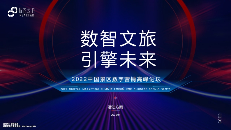 NEARFAR数智文旅引擎未来2022中国景区数字营销高峰论坛2022 DIGITAL MARKETING SUMMIT FORUM FOR CHUNESE SCENIC SPOTS活动方案2022年时代浪潮下,景区数字营销未来关于大会的主题思考?2215实现景区数字化,我们还有多远的路?在疫情防控常态化背景下,数字化经济为文产业高质量发展提供了更多样的可能性,是未来文旅产业发展的重要趋势。国家政策时代文背核心近年来从中央到部委频频出台政策数字旅的核心是文旅与科技的有机结合,鼓励旅游景区探索融入大数据、物通过科技赋能,带动整个文旅产业的转型和联网、SG、AN等数字科技推动智慧高质量发展。景区数字化的优势体现在信息旅游,优化旅游服务流程、创惭多元发布、实时数据统计、景区设施资源、运营旅游产品供给、提高旅游产品竞争管理智意化等方面。力,推动产业创新升级。