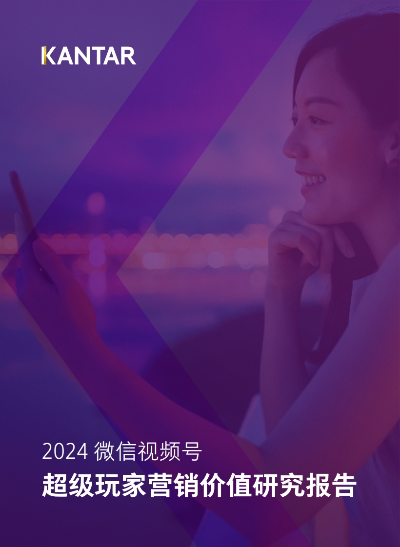 KANTAR2024微信视频号超级玩家营销价值研究报告KANTAR目录报告亮点前言研究说明核心洞察数据第一章微信视频号关键数据概览微信视频号用户流量特征微信视频号内容消费矩阵微信视频号商业化潜力第二章微信视频号用户价值分析17高价值人群分类逻辑高价值人群中的“超级玩家”成熟型:高消费行动的重度微信视频号用户享乐购物狂/佩奇妈妈/小镇贵妇成长型:消费审慎的重度微信视频号用户佛系老爹/青年逐梦者/宝藏大学生高潜型:高消费潜力的微信视频号用户都市新贵/品质官豪/六边形战士KANTAR报告亮点三重支撑“微信视频号”成为微信生态新增长极010203优质的用户流量:丰富的内容生态:高商业化能力:内容消费时长增长3倍万粉作者增长4倍微信视频号带货直播销售额增长800%五大洞察微信视频号超级玩家蓝海级商业潜力0102使用粘性高:54%的用户主动进入微信视爱看的内容多,自己也愿意创作:美食、频号,有15%的用户在微信视频号里驻足搞笑和娱乐内容最受欢迎,39%的用户已超过一小时成为微信视频号创作者0304直播渗透率高:购物带货直播、美食品尝社交属性强:遇到优质内容,77%的用户直播和娱乐综艺直播是微信视频号用户的会选择爱心点赞,60%的用户选择转发,最爱53%的用户会选择点击大拇指05购物欲望强:92%的用户期待在微信视频号上进行购物,61%的用户已经在微信视频号上开展了购物,87%的用户表示未来会在微信视频号里持续购物《2024微信视频号超级玩家营销价值研究报告》3