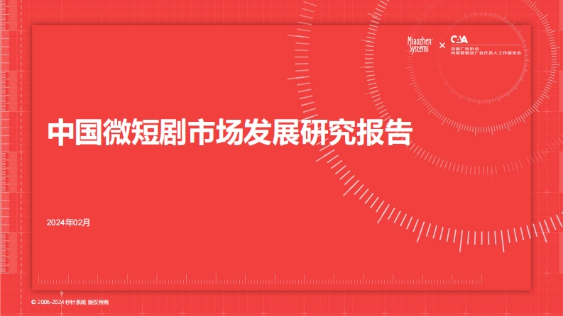 C中国微短剧市场发展研究报告2024年02月写在前面:为什么要研究中国微短剧市场?国家广播电视总局发布数据显示,2022年微短剧上线备数量达到336部,同比增长214%,2023年这个数字继续增长到584部。爆发式增长迅速吸引到越来越多的人力、技术和投资,产业链快速形成并持续迭代。产能迅速提升的同时,随着更多更专业的团队和先进的技术涌入,以及络项监管政第的建立、健全,微短剧的发展势必会在短期内摆锐“野蛮生长”的状态,其内容趋于精品化,其宣发方式也会更加科学,在由此基础上,我们能够预见图到微短居的商业化模式必将走向成熟。秒针系统致力于为企业提供计划、测量、评估、归因、优化等一站试的全域营销数字化产品及解决方案,秒针营销生态中心关注营销行业发展态势,通过用户、内容、商业化程度等维度科学评估,帮助市场发现新价值流量,并与营销市场各角色/住体积极建立生态合作,促进市场交易与增长,和2017年关注家庭智能大屏、2018年关注信息流广告、2019年关注内容营销、2020年关注媒介生态、2021年关注新锐品牌、2022年关注元宇宙、2023年关注人工智能一样,秒针一直关注营销市场的最度化。我们希望通过这份报告,通过报告中用户数的分析和专家观点的分享,帮助读者客观地认识、了解中国微短市场。当然,微短锯市场的发展可谓日新月异,秒针系统希望能以此为起点,通过持续地市场追踪和研究,逐步梳理中国微短市场的成长逻辑和路径,对微短营销策路的科学定提供理性、客观的支持写在前面:什么是微短剧?·2022年12月6日,国家广播电视总局印发《关于推动短剧创繁柴发展的意见》的通知中提到:短剧通常采用单集时长15-30分钟的系短剧列剧、集数在6集内的系列单元剧、20集内的连续剧、周播剧等多种形态,·2020年12月8日,国家广播电视总局出台《关于网路影视剧中微短内容审核有关问题的通知》,正式将微短剧定义为单集时长10分钟以内的网络影视剧,是足继网络影视剧、网络电影、网络动画片后第4种官方认可的网络影视作品形态,微短剧2022年11月14日,国家广播电视总局发布《关于进一步加强网络微短剧管理实施创作提升计划有关工作的通知》,将微短剧内容标准定义为:单集时长从几十秒到15分钟左右、有着相对明确的主题和生线、较为连续和完整的故事情节2022年底,广电总局在“更点网络影视信息备案系统网路短版块”中对微短居时长更新为:单集备案时长规啶为20分钟以内。