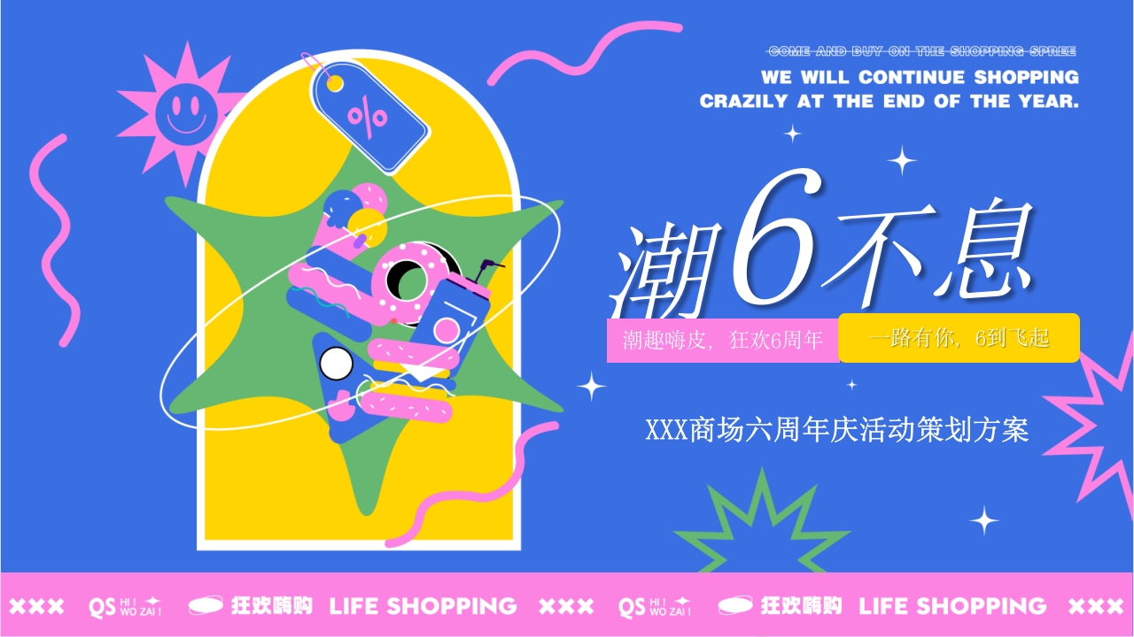 COME AND BUY ON THE SHOPPING SPREEWE WILL CONTINUE SHOPPINGCRAZILY AT THE END OF THE YEAR.潮趣嗨皮,狂欢6周年路有你,6到飞起XXX商场六周年庆活动策划方案狂欢购LIFE SHOPPING XXxWE WILL CONTINUE SHOPPINGCRAZILY AT THE END OF THE YEAR.RELAX壹策划阐述贰内容规划+6露营规划狂欢隋购LIFE SHOPPING XXXCOME AND BUY ON THE SHOPPING SPREEWE WILL CONTINUE SHOPPINGCRAZILY AT THE END OF THE YEAR.PART-ONE策划阐述ACTIVITY DESCRIPTION
