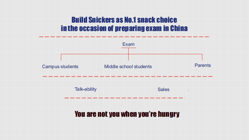 Build Snickers as No.1 snack choicein the occasion of preparing exam in ChinaExamCampus studentsMiddle school studentsParentsTalk-abilitySalesYou are not you when you're hungry