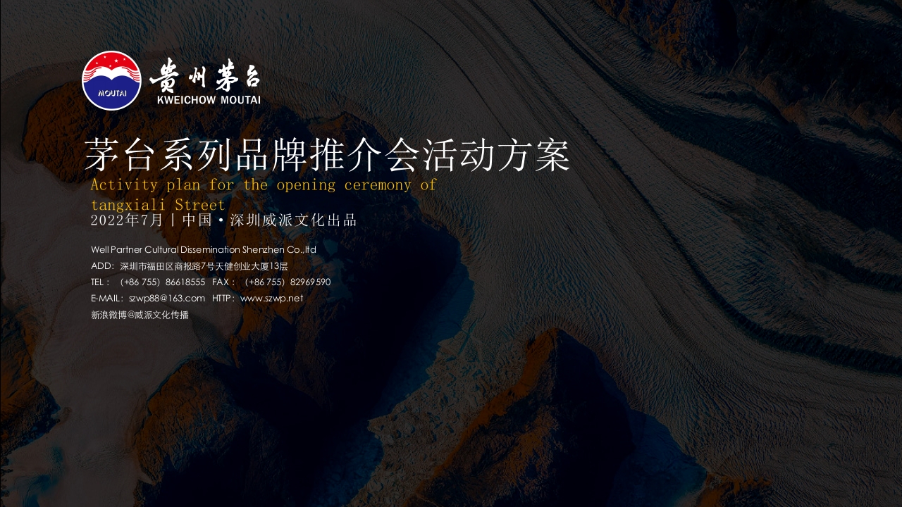 KWEICHOW MOUTAI茅台系列品牌推介会活动方案Activity plan for the opening ceremony oftangxiali Street2022年7月1中国·深圳威派文化出品Well Partner Cultural Dissemination Shenzhen Co..ltdADD:深圳市福田区商报路7号天健创业大厦13层TEL:(+86755)86618555FAX:(+86755)82969590E-MAIL:szwp88@163.com HTTP:www.szwp.net新浪微博@威派文化传播「五场喜逢·茅台1935上市推介会活动」1935MOUTAI适动场次:深圳(两场)佛山珠海活动人数:300人活动调性:高端性文化性壹1935Activity site layoutPRODUCE OFCONTENT活动流程Activity site process