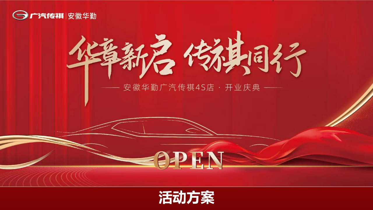 广汽传阴安徽华勤安徽华勤广汽传祺4S店·开业庆典OPEN活动方案贴心服务,客户至上公司成立于2021年9月始终秉承“匠于心,品于行”的企业理念4S店位于包河汽车城长春街15号为每位顾提供专业贴心的服务这欢重装开业同心同行开业主题导出华章新启传祺同行√华章新启:安徽华勤重装开业,新的篇章即将开启√传祺同行:始终秉承“匠于心,品于行”的企业理念,未来同样与传祺同行,与客户同行