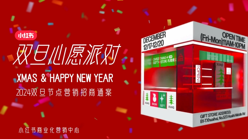 小红书DECEMBERFri-Mon ftAM-10PMXMAS HAPPY NEW YEARFOPEN2024双旦节点营销招商通案GIFT STORE ADDRESS:小红书商业化营销中心小小红书在小红书,年末辞旧迎新氛围被分享和看见,仪式感满满一个人的仪式感群人的仪式感20234主题派对创意妆容交换礼物13.5M+120M+51.6M++2589%+10159%+910%圣诞妆平安夜礼物年终总结犒劳自己+21509%+14509%+8589%450M+新年计划+100889%+1265%+12999%50.8M+新年家宴新年妆容新年礼物小小红书双旦年轻人浓度高,TA们关注礼物交换、倒计时、妆容穿搭、仪式感跨年131亿113%#圣诞#跨年跨年趋势内容同比涨年轻、精致有仪式感、生活在高线城市22.3亿次浏览19亿次浏宽72%跨年要有仪式感年轻礼物交换年计时69%潮流时尚61%高线城市