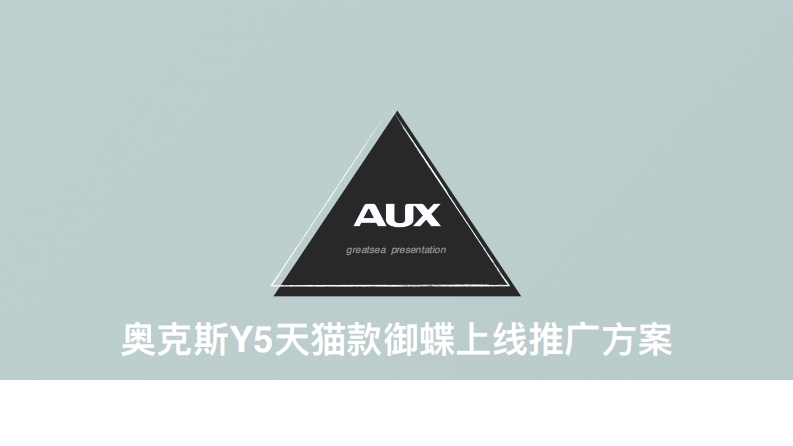 AUXgreatsea presentation奥克斯Y5天猫款御蝶上线推广方案Brief回顾传播背景奥克斯将于2018年下半年推出重点产品Y5系列挂机御蝶款,定位为「女性空调」。作为国内首个推出「女性空调」的空调品牌,奥克斯将聚焦18-35岁女性群体展开传播。传播目标此次新品传播,借助双十一热度推广产品引流销售为核心,通过女性感兴趣的话题和互动形式展开线上营销,促进销售,同时传递品牌好感度,提升用户对奥克斯空调在行业品类的品牌认知。我们的任务如何上我们的品牌和产品抓住年轻女性的心!·打破女性消费者对「空调!刻板认知束缚,变成年轻女性喜爱的空调产品;·探求品牌及产品成为类面膜彩妆的网红爆款产品的机会及可能性;