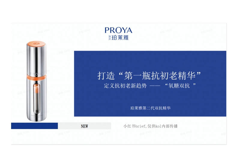 PROYA珀莱雅打造“第一瓶抗初老精华”定义抗初老新趋势一一“氧糖双抗”珀莱雅第二代双抗精华NEW小红书brief,仅供kol内部传播双抗精华简介第二代双抗精华o产品官方名称珀(b6)莱雅弹润透亮青春精华液·核心功效抗氧化+抗糖化=抗初老抵御暗沉、焕亮肤色、减淡黄气、抚平细纹、提升肌肤自身修护力糖化成因及表现氧化成因及表现饮食中油炸、辛辣、糖分摄入过多:人体呼吸、紫外线照射、空气污染缺乏运动电子产品辐射肤色暗黄出油氧化暗沉失去光泽皮肤或妆感显“脏”肌肤粗糙毛孔粗大干燥缺水油脂过多分泌黑色素聚集产生斑点、瑕疵