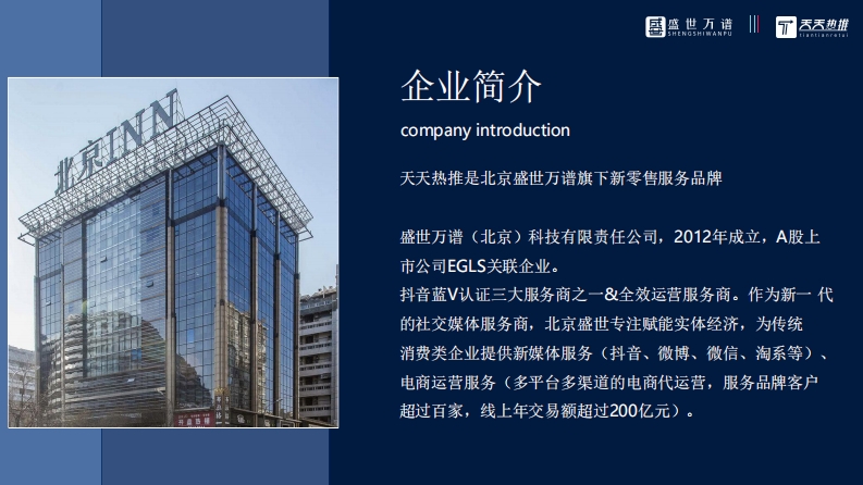 企业简介company introduction天天热推是北京盛世万谱旗下新零售服务品牌盛世万谱(北京)科技有限责任公司,2012年成立,A股上市公司EGLS关联企业。抖音蓝V认证三大服务商之一&全效运营服务商。作为新一代的社交媒体服务商,北京盛世专注赋能实体经济,为传统消费类企业提供新媒体服务(抖音、微博、微信、淘系等)、电商运营服务(多平台多渠道的电商代运营,服务品牌客户超过百家,线上年交易额超过200亿元)。盛世运营团队图:直播间图:演播大厅·项目管理和策划团队人数100+重点城市保证3支以上团队供调配·全国签约专业落地拍摄团队200+·整合全网新闻媒体合作资源2000+●全国签约兼职编剧创意人员1000+服务案例遍布全国一、二级城市抖音介绍5亿MAU抖”动的时代国内月活用户突破5亿抖音短视频成为最响亮的音符截至2018年12月,抖音日活跃用户数已突破2.5亿,月活跃用户数突破5亿:国内日活用户突破2.5亿随着“抖音吃法”、“网红城市”、“网红主持人”、“网红打卡”风靡,众多抖音用户前往网红旅游地,寻找抖音同款。抖音成为新的带货神器。海外月活用户超过1.5亿数据来源:2019年7月15日(2018抖音大数据报告》