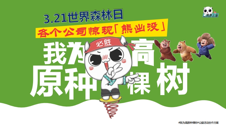 3.21世界森林日各个公司惊现「熊出没」必胜原种树我为高原种树#公益话动哈作方案活动主题:#我为高原种棵树#青海省玉树藏族自治州地处三江源头,平均海拔4000多米,地形以山地高原为主,海拔高,温差大,含氧量低,气候严酷。在玉树,曾流传着“树如玉贵”的说法。高寒缺氧,气候多变,即便再细心照顾,大多数树苗还是难活。“在这里种活一棵树,比养一个娃娃还难。”但不管条件有多恶劣,也阻挡不了玉树人对绿色的渴望。3月21日世界森林日,青海省生态环境厅(申请中)X三江源生态保护基金会X BOSS直聘|直直公益发起[我为高原种棵树」公益联名活动。项目概述公益项目主题:#我为高原种棵树#我的非人类同事我的非人类同事活动内容涉及10家高质量品牌联动,BOSS直聘发布「招木启示」邀请各品牌合作方力高原种树。合作方以品牌自身调性阐述一条特有绿色生活slogan文案。注:slogan文案中每个字词将默添加「木」字偏旁部首,以此表达「我为高原种棵树」活动核心。活动后由BOSS直聘|直直公益统一为三江源地区捐款(树苗养护专用金)。项目时间:2022.3.21-2022.3.31往期活动合作方参考:鸿星尔克、旺旺、古茗茶饮、洽洽坚果、汇源果汁、菜鸟裹裹、哔哩哔哩、便利蜂、特步、苏宁易购等,传播平台:微博数英SocialBeta梅花网哔哩哔哩豆瓣上微博发现新鲜中国数字整合营领先的社交媒体营销者的信息中我的精神角落销及招聘网站