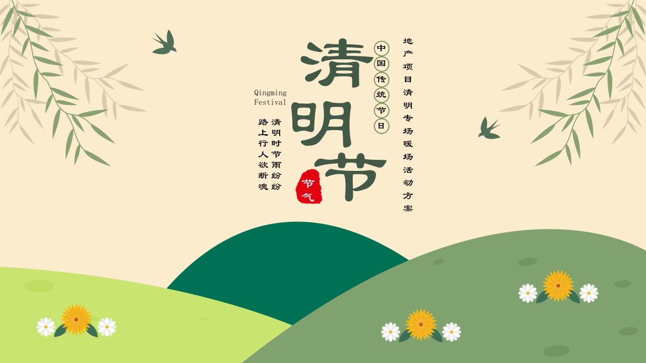 Qingming地产项目清Festival中国传统节日上行人欲新魂清明时节雨纷纷专场暖场活动方案录CONTENTS壹贰策划思路Activity overview氛围布置Atmosphere layout活动规划Warm upactivities方案附录Scheme appendix壹策划思路Activity overview