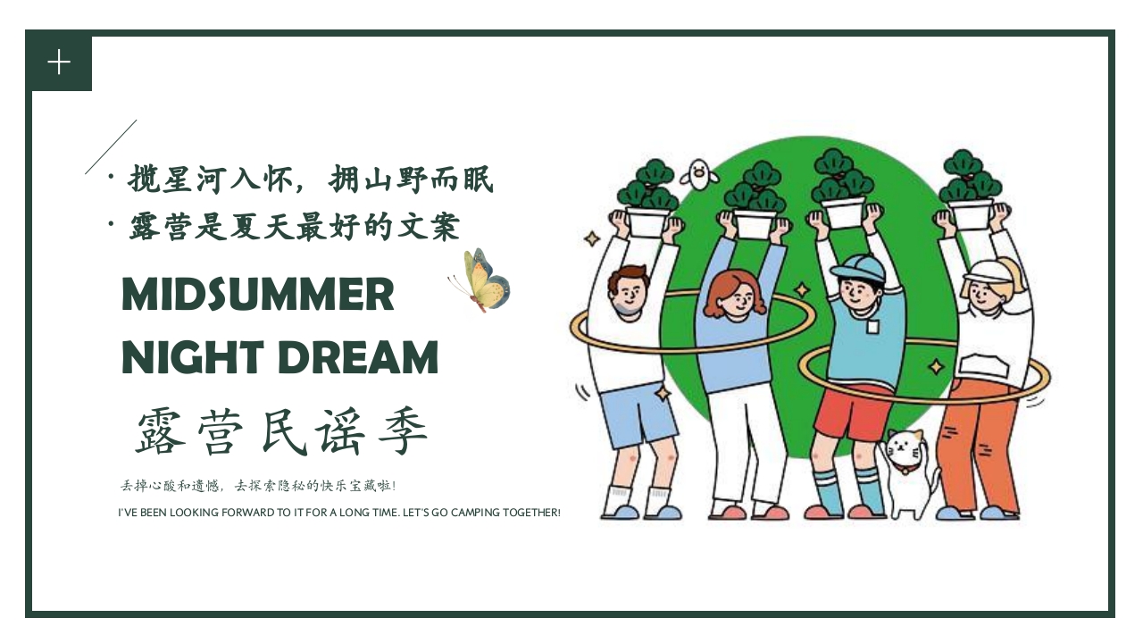 揽星河入怀,拥山野而眠露营是夏天最好的文案MIDSUMMERNIGHT DREAM露营民谣季丢掉心酸和遗憾,去探索隐秘的快乐宝藏啦!I'VE BEEN LOOKING FORWARD TO IT FOR A LONG TIME.LET'S GO CAMPING TOGETHER!记忆中的夏天HELLO SUMMER是周杰伦的《七里香》:窗外的麻雀,在电线杆上多嘴是温岚的《夏天的风》:夏天的风,温柔的吹过是李玖哲的《夏天》:整个夏天想与你环游世界L系列(亿36,L26)每个音符都充满灵感洗净耳根的最佳选择HELLO!SUMMER如果你受够了那些浮躁的、跟风的、假高深的伪嘻哈爱好者们的狂欢,那么这里可能是洗净你耳根的最佳选择